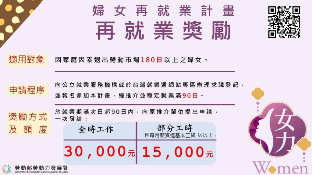 台南就業中心洪儷瑋主任表示小琪的故事是許多婦女的縮影,為鼓勵因家庭因素離開職場婦女重返工作,勞動部推出為期3年的「婦女再就業計畫」,以「自主訓練獎勵」鼓勵自行規劃參加訓練提升職能,最高可獎勵3萬元;運用「再就業獎勵」穩定就業達3個月,再加領3萬元,並提供雇主「工時調整獎勵」以鼓勵為婦女員工規劃調整工時以兼顧家庭需求,每一職缺每個月可領3仟元獎勵金,最長補助1年。