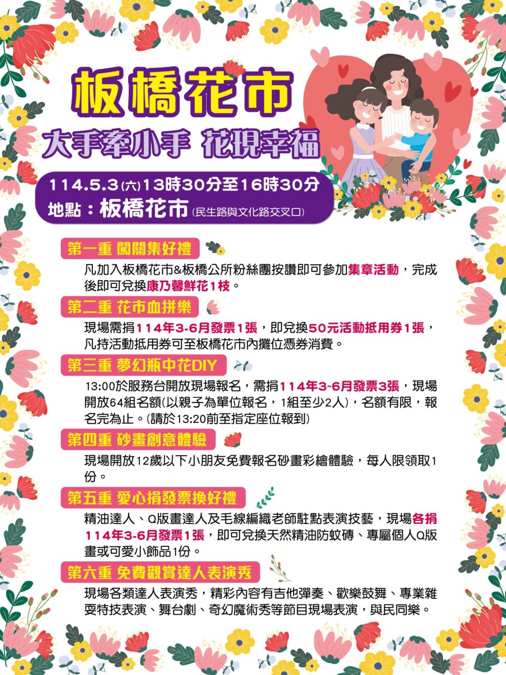 母親節前夕板橋區公所於114年5月3日(六)下午1點30分至4時30分在板橋花市舉辦「板橋花市大手牽小手 花現幸福」慶祝母親節活動,現場有夢幻瓶中花DIY教學活動、逛花市闖關集好禮、捐發票換抵用券及節日限定禮等多項活動,並加入街頭藝人精彩演出,歡迎市民朋友踴躍參加。