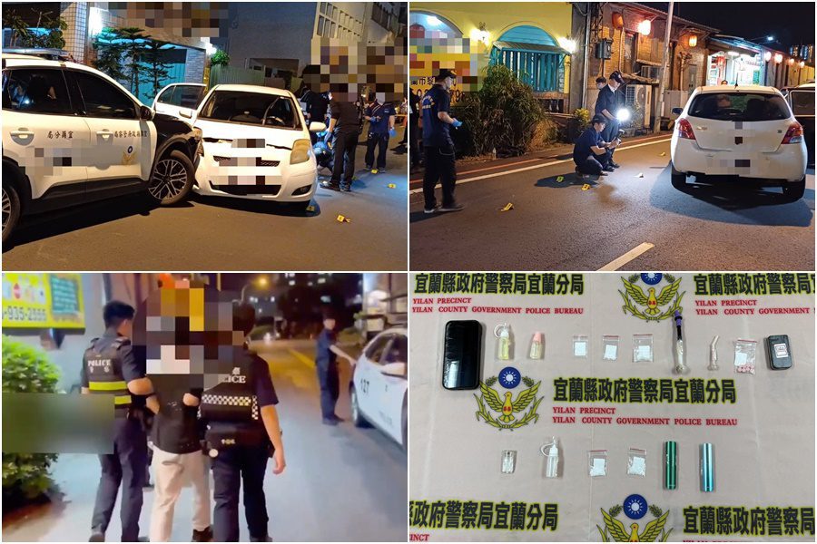 宜蘭街頭再度上演警匪飛車追逐的驚悚畫面!宜蘭分局員警4月27日晚間,在宜蘭市東港路與女中路口發現1輛自小客車闖紅燈,郭姓駕駛拒絕攔查加速逃逸,警方急起直追並展開圍捕,郭嫌竟駕車衝撞警車,員警立即拔槍朝車輪連開三槍當場逮捕。