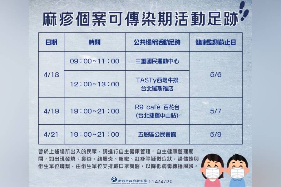 衛生局表示,麻疹為高傳染性疾病,出疹前後4天均具傳染力,籲請民眾留意,曾於4月18日至三重國民運動中心、TASTy西堤牛排台北羅斯福店,4月19日至R9 cafe 百花台(台北捷運中山站),4月21日至五股區公民會館活動之民眾,請自主健康管理18天,如有發燒、鼻炎、結膜炎、咳嗽、紅疹等疑似症狀,儘速就醫並告知接觸史;另自主健康管理期間應避免出入公共場所,並儘量佩戴口罩,以降低病毒傳播風險。