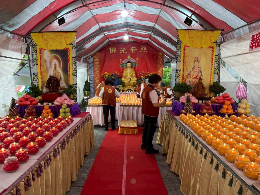 25日蘭陽平原天朗氣清,中午11點半灑淨後,誦持〈大悲咒〉與《寶篋印陀羅尼經》共修,人人齊心誠心稱念佛號,現場莊嚴肅穆。啟燈儀式12點展開,為3天2夜的活動揭開序幕,現場棚頂高懸大悲咒旗,主壇城設置卍字燈,映襯地面紅毯與兩側排列整齊的萬佛燈架,每盞佛燈供奉不同尊佛。師兄姐們齊心點亮燈火,那一剎那,萬燈齊明,耀眼光亮烙印於心,心光與佛光交融,彷彿形成「因陀羅網」重重無盡善的結界。