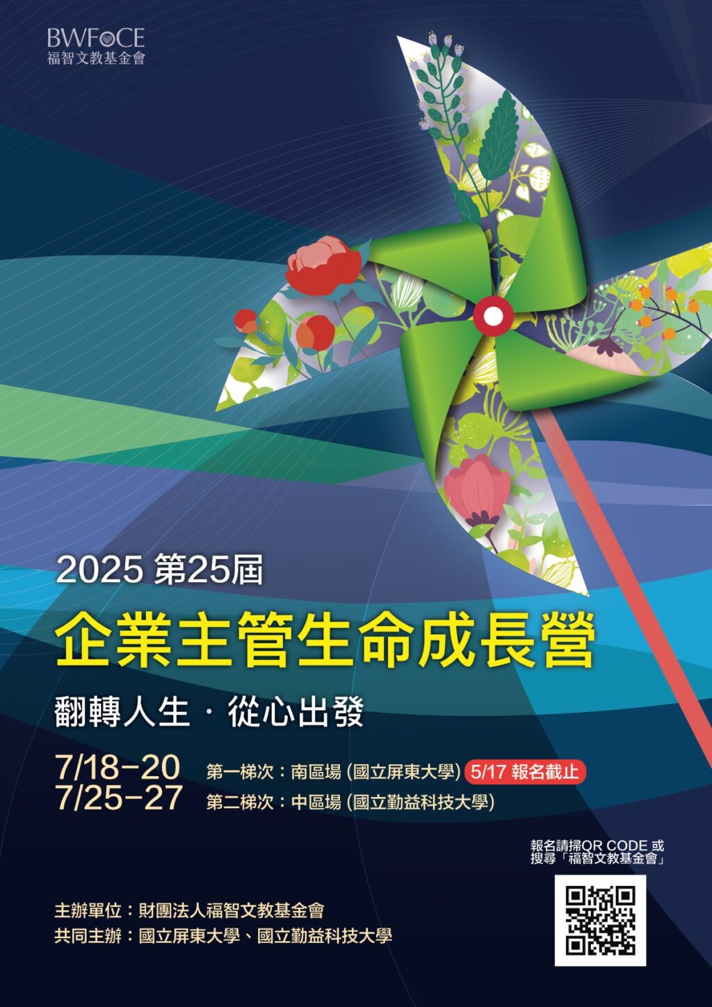 【記者范家豪/新北報導】 翻轉人生,從心出發!致力於心靈提升的財團法人福智文教基金會將舉辦第24屆「企業主管生命成長營」,南區場7月18日至20日於國立屏東大學、中區場7月25日至27日於國立勤益科技大學舉辦。今年,2025「企業營」以「永續發展、正向思考、關愛生命、幸福傳遞」為課程主軸,透過戲劇、講座、音樂饗宴等多元方式,從「觀功念恩」心靈解憂出發,希望帶動企業人士從觀念到行動,以積極正向的思惟,開展心靈的高度與韌性,創造幸福永續的企業文化。迄今已有超過兩萬七千多名企業人士參與此營隊,誠摯邀請公民營企業單位主管與菁英,以前瞻的視野與格局踴躍報名。報名截止日為5月17日,請參閱報名網址:https://reurl.cc/rEx5ob。