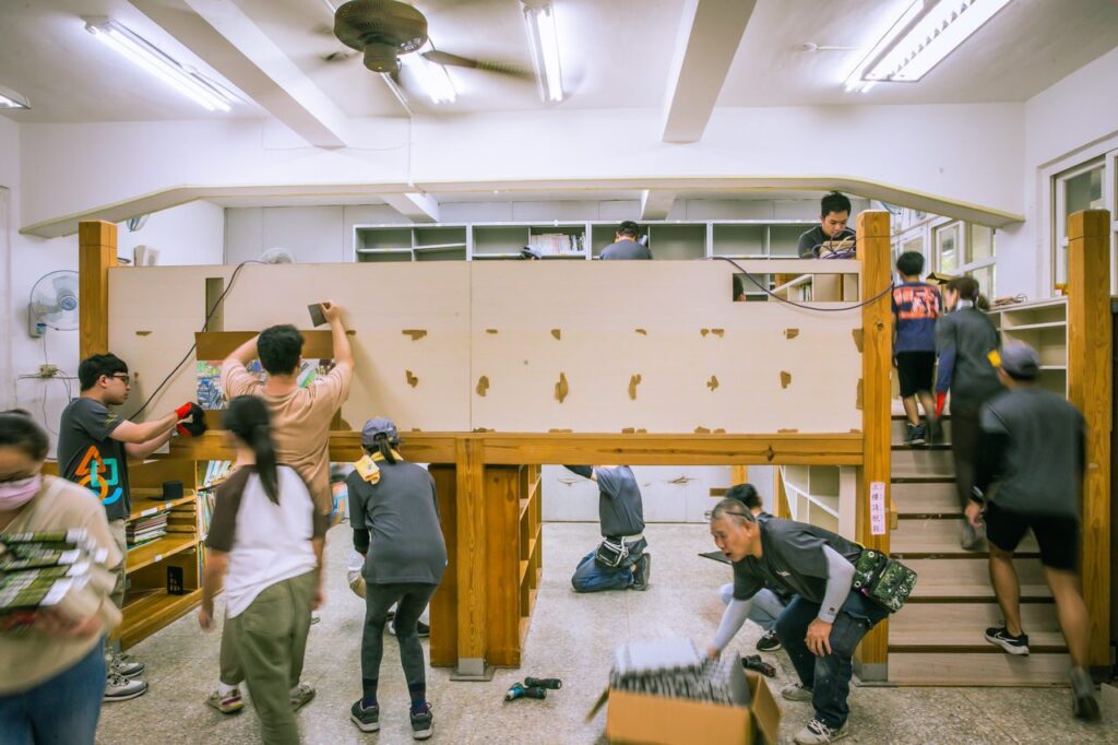 儘管是週末,當志工們抵達校園時,迎接他們的卻是一片熱鬧景象,共有24名學童與家長在校內等候,準備投入校園改造行動。志工與前來響應的學童及家長,拆分兩組分頭修繕,人較多的為改造重點-拆除架高平台,大夥依序將書籍從架上取出,才能拆除木架。搬書到一半,學童們多次分心,熱情的與志工分享愛看的書籍跟心得,現場歡笑聲不斷。另一組人手則在走廊及低年級教室,負責壁癌施作,學童與家長在志工教學下,合力刨除牆面剝落的油漆,部分個頭嬌小的學童,由於難以刮除高處壁癌,便主動拿起掃把,清掃地面上的粉塵。