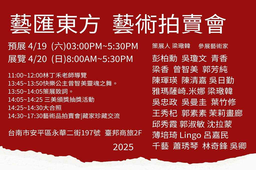 【記者吳玉惠/臺南報導】 「日畫廊」籌畫集結南北二十多位藝術家及畫廊收藏,以「藝術百匯」形式現場展售原創畫作即將在2025年4月20星期日,於臺南市安平區臺邦商旅2樓(永華二街197號)舉辦一場別開生面的藝術快閃展覽。活動從4/19(六)下午3:00~5:30預展,及正式展覽4/20(日)上午8點至下午5點30分,,並結合趣味拍賣、紅白時尚派對活動,為藝術愛好者、收藏家及商界人士打造一場充滿活力的藝術盛宴。