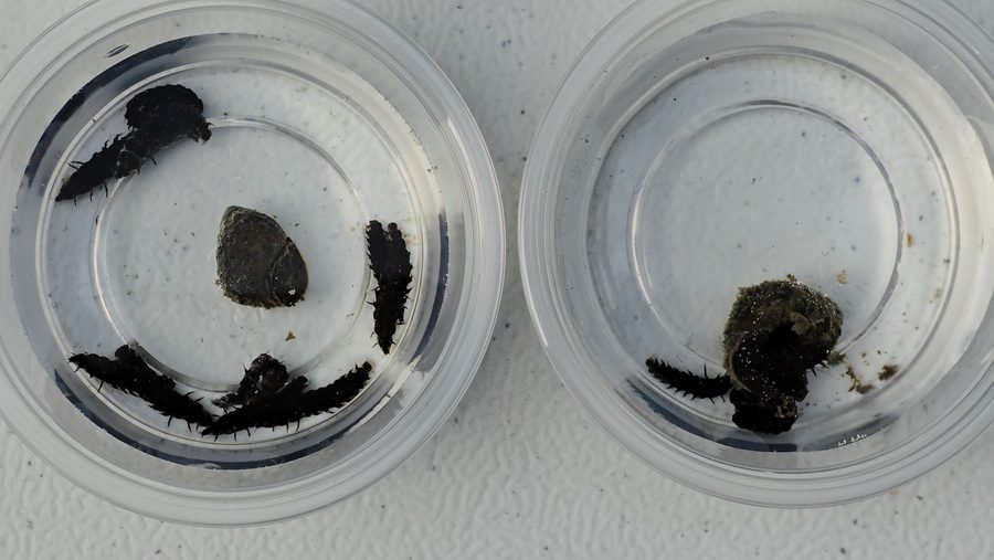 ▲野放時的黃緣螢幼蟲與牠們愛吃的田螺。(陳木隆攝)