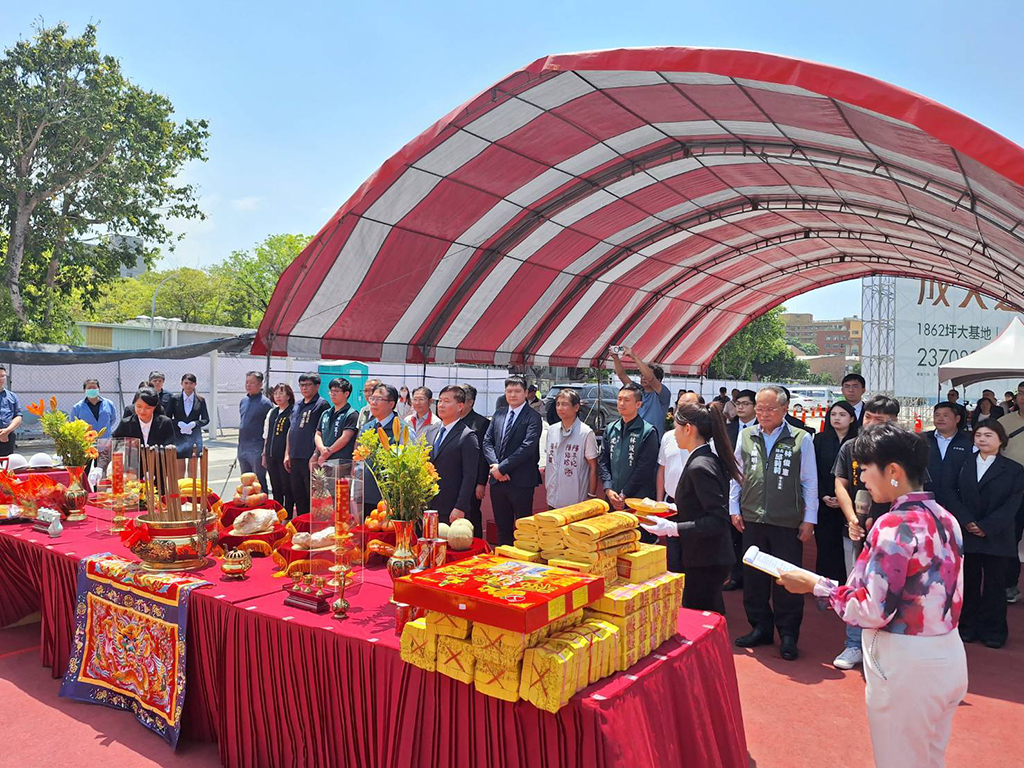 【記者吳玉惠/臺南報導】 臺南市北區「宜居東興」社宅今(16)日動土,市長黃偉哲與國土管理署副署長徐燕興及臺南市議會沈震東議員、許至椿議員、Ingay Tali 穎艾達利議員、周嘉韋議員一同祈福工程順利。此案透過都市更新容積獎勵方式,由廠商協助開闢公共設施並優先興建社會住宅104戶,可節省公帑約10億元,是臺南繼宜居成功、宜居仁愛之後,第3件動土開工的公辦都更開發案。