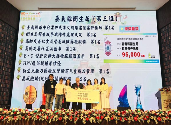 日前在全國保健大會上,國健署頒獎表揚113年推動保健業務績優單位,嘉義縣囊括菸害防制查緝違法網路平台、營養照顧、高齡友善社區、BC型肝炎篩檢、HPV疫苗接種、新生兒聽力與兒童視力管理、高風險婦幼關懷等9項大獎、5項第一名,獲頒「保健業務考評分組優等獎」,成果斐然。