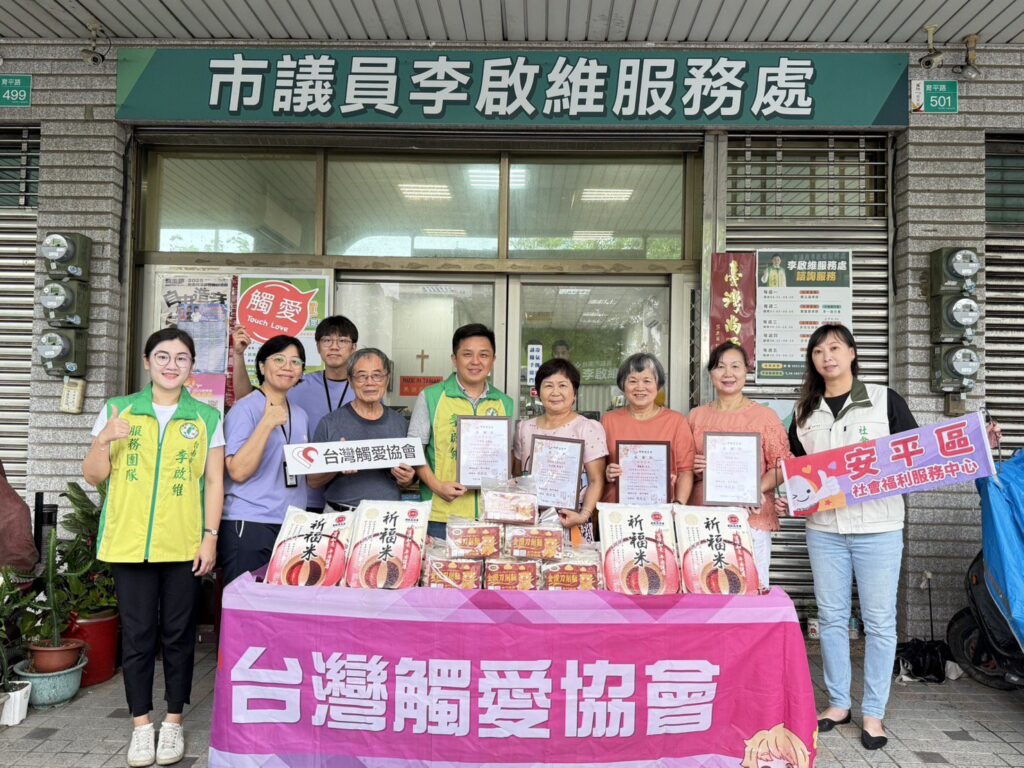 市議員李啟維號召社會善眾熱心企業,共同捐助逾千公斤米麵物資及現金給台灣觸愛協會,今(13)日在安平區李啟維服務處舉行捐贈儀式,協會理事長張雅惠、行政主任林家瑜、常務監事許永熙及社工師鄭庭舜出席代表受贈,社會局由安平社會福利中心李雨珍督導代表出席,理事長張雅惠感謝社會的愛心,並說明協會秉持「觸愛精神」長期致力關懷弱勢族群,尤以單親或脆弱家庭的兒童與青少年為主要服務對象。