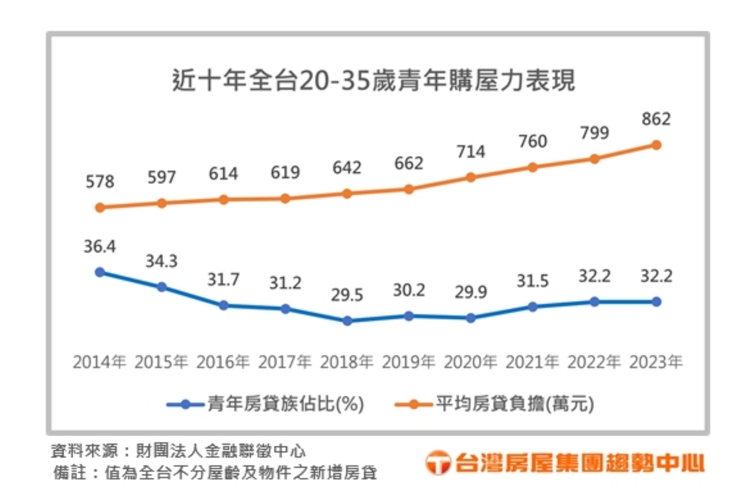 通膨及電價預期上漲的趨勢下,青年購屋的壓力可說是空前沉重,雖說有新青安優貸的優惠及政府持續性的補貼房貸利息可以稍稍喘氣外,青年購屋比例還是呈現下滑趨勢。根據台灣房屋集團依據金融聯徵中心資料統計,全台20~35歲青年2023年平均背負房貸金額為862萬元,房貸壓力創下史上新高!同時,近十年來青年背負房貸金額一路攀升,相比2014年,平均房貸負擔約578萬元,現今Z世代水蜜桃族,房貸壓力比十年前的Y世代草莓族,足足增加了約280萬元。隨房貸壓力年年攀升,也影響青年購屋族比例逐漸下滑,2023年青年房貸族比例約為32.2%,相比十年前減少了約4.2個百分點。