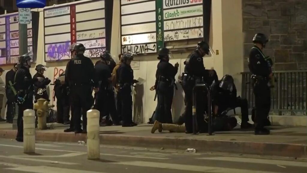 美國當地時間6月11日,美國洛杉磯警察局表示,洛杉磯市中心10日晚有203人因未能疏散而被捕,17人因違反宵禁而被捕,另有3人因持有槍支而被捕,1人因使用致命武器襲擊一名警察而被捕,還有1人因向洛杉磯警察局的飛艇發射激光而被捕,在警方的部分則是有兩名洛杉磯警察受傷。由於抗議活動持續,洛杉磯市中心部分地區,將在晚上八時到早上六時繼續實施宵禁。