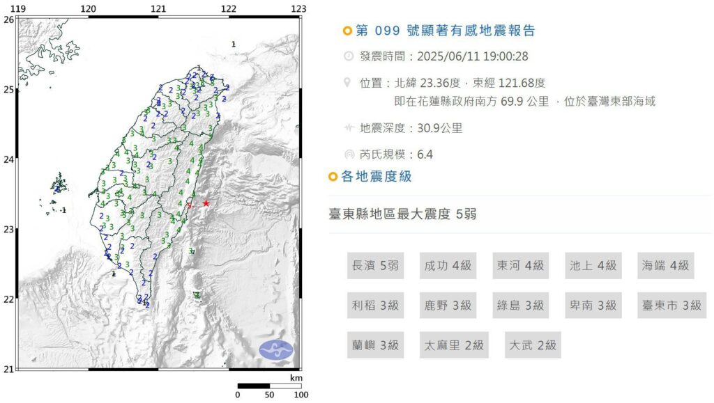 台灣時間下午5點,在花蓮縣政府南方69.9 公里,位於臺灣東部海域發生規模6.4有感地震,各地震度台東長濱為5弱,成功、東河、池上、海端鄉及花蓮、南投、嘉義、雲林、臺中和彰化等縣市地區最大震度為4級。