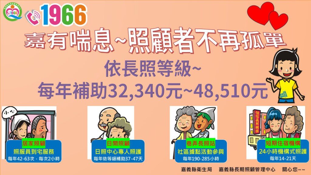 嘉義縣政府為了讓照顧者能適時紓壓、恢復體力,減輕家庭照顧者負擔,鼓勵照顧者善用長照喘息服務的資源,不論是照服員到宅提供的居家式喘息、日照中心及社區據點提供的社區式喘息,或是住宿機構提供的24小時機構式喘息,只要提出申請,由專業人員到宅評估與安排服務,每年依長照等級可補助32,340元~48,510元,為照顧者需求量身規劃合適的照顧方案。