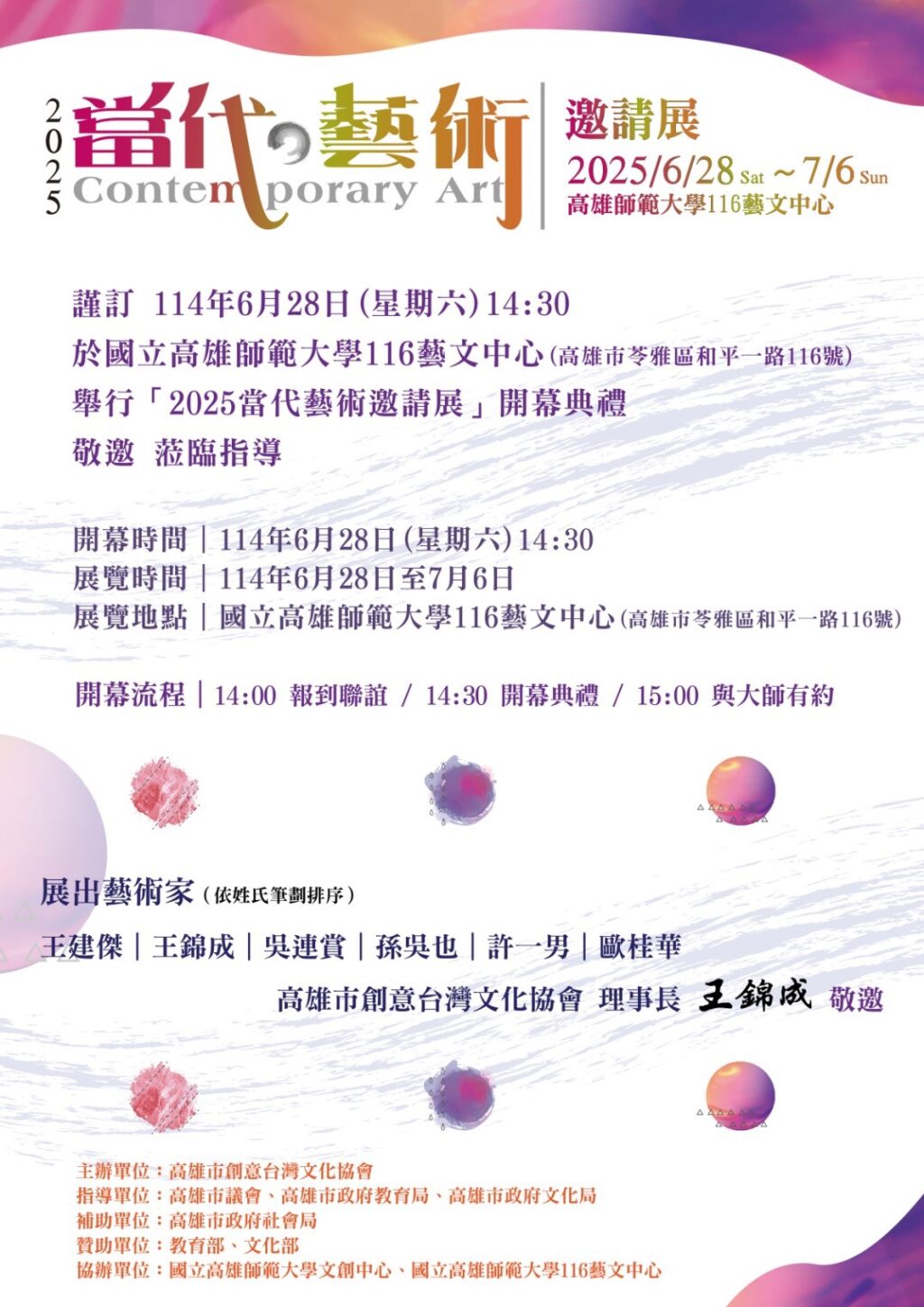 【記者吳奕/高雄報導】 高雄市創意台灣文化協會自2022年以來,主辦當代藝術聯展即將進入第四屆,今年以「2025當代藝術邀請展」姿態呈現給你!將於114年6月28日(星期六)下午2:30在國立高雄師範大學116藝文中心舉行開幕茶會。