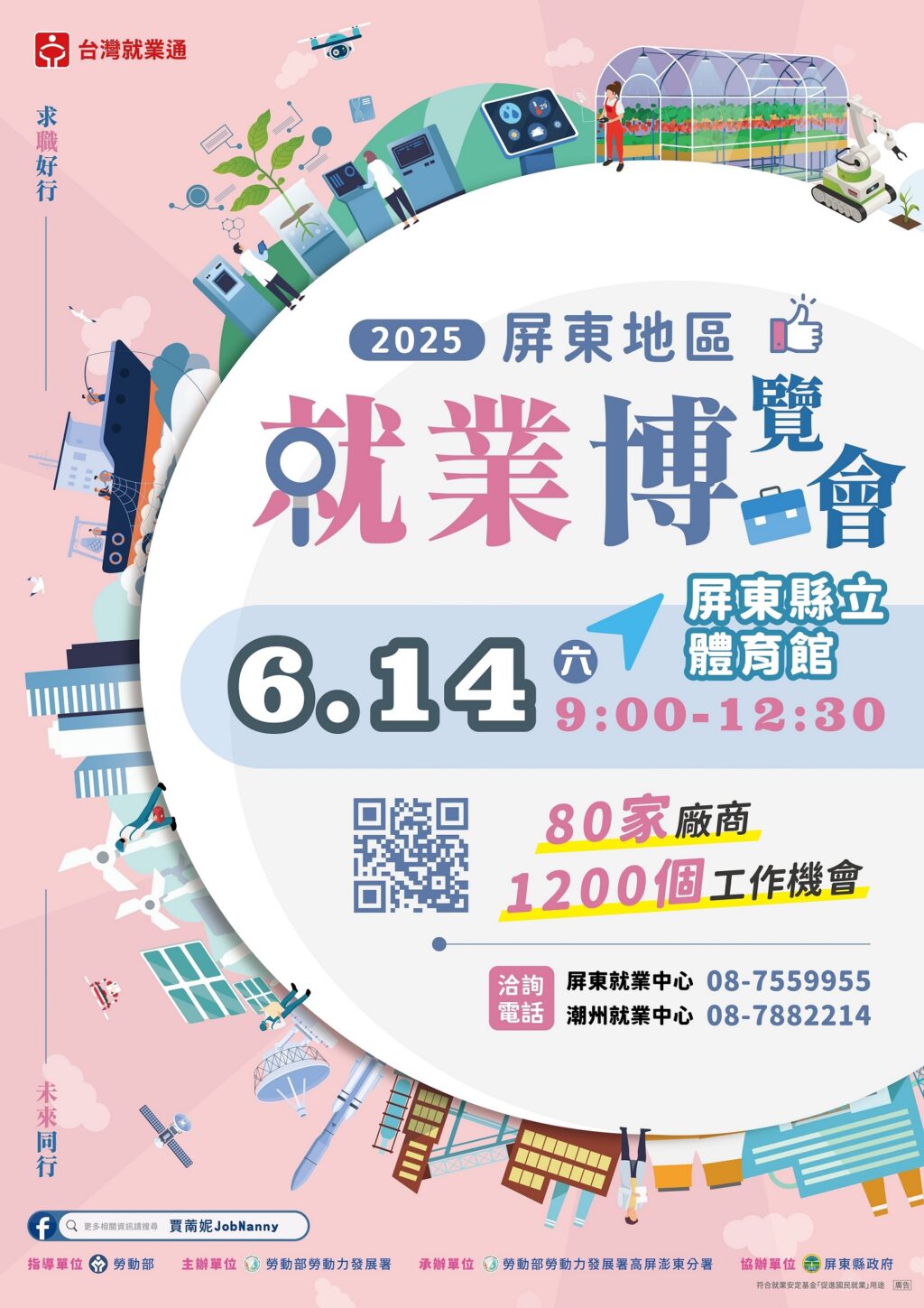 【記者范家豪/屏東報導】 由勞動部勞動力發展署高屏澎東分署(以下簡稱高分署)主辦「2025屏東地區就業博覽會」,將於6月14日(星期六)上午9時至12時30分在屏東縣立體育館盛大登場,共有86家徵才廠商,提供1,562個工作機會,是屏東地區年度規模最大的就業博覽會,歡迎高屏地區想要找工作、轉換工作的民眾,把握難得的求職機會,為您的職涯發展注入無限可能。
