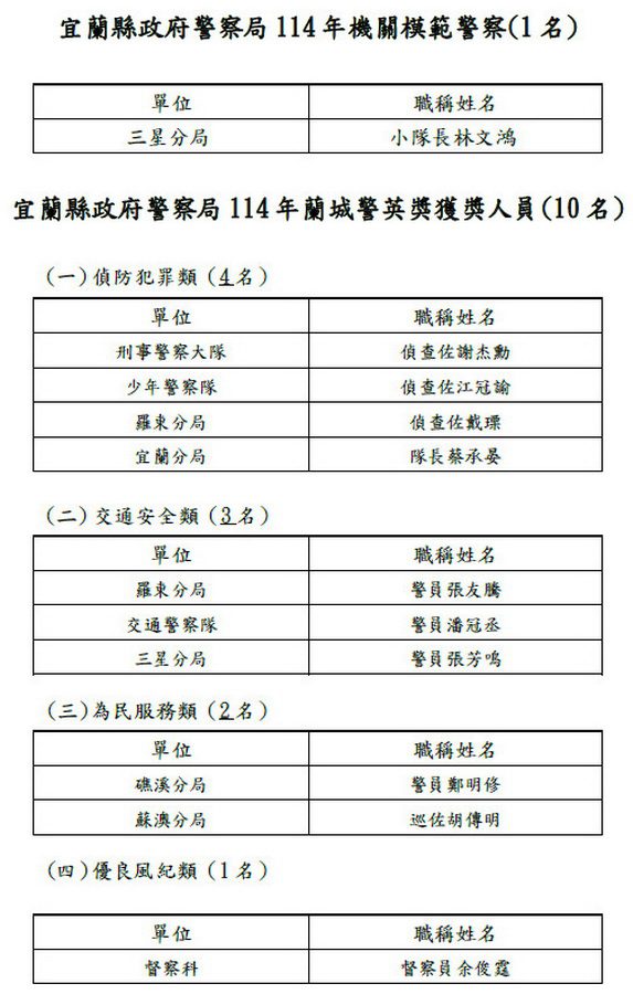 警察局強調,這些得獎人,是上千同仁中表現最為傑出的楷模,期許他們持續精進作為,也鼓勵所有同仁見賢思齊,在各自崗位上發揮所長,共同為守護宜蘭這片土地而努力。