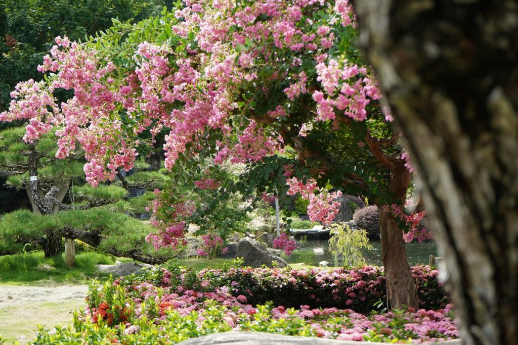 隨著夏季腳步悄然來臨,彰化永靖成美文化園迎來一年一度的百日紅(紫薇花)盛開季節,每年6至9月期間限定綻放的粉紅花海,數百株粉紅紫薇沿著步道與庭園錯落盛開,如瀑布般自枝頭傾瀉而下,浪漫景緻蔓延至園區的角落,與禪風造景交織出浪漫如詩的夏日風景。這片夢幻花海不僅成為情侶拍照打卡的熱點,也吸引許多親子家庭前來共度美好時光。為歡慶暑假來臨,自6月28日至8月3日止,園區推出12歲以下兒童免費入園優惠,邀請大小朋友一同走入百日紅花海,在自然美景與歡笑中,展開一段溫馨的夏日回憶。