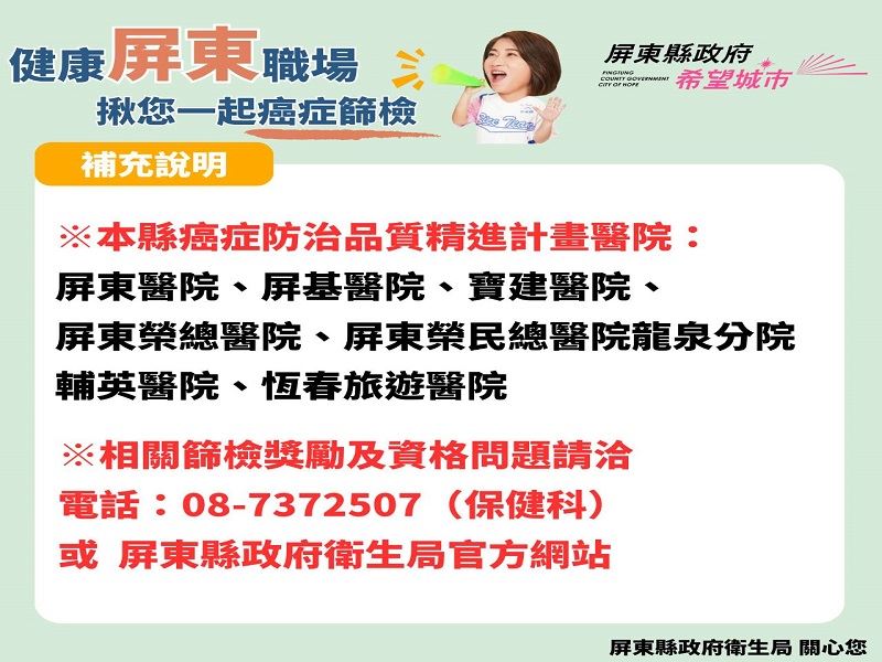 衛生局表示,揪團員工持健保卡前往本縣癌症防治品質精進計畫醫院(包括屏東醫院、屏基醫院、寶建醫院、屏東榮總醫院、屏東榮民總醫院龍泉分院、輔英醫院、恆春旅遊醫院)完成雙癌篩檢,即就送2,000元禮券獎勵 (限量150組);另考量員工忽略定期癌篩或勞工朋友輪班、需請假費時往返醫院檢查,鼓勵本縣勞工事業單位設站,於執行勞工健檢納入公費四癌篩檢(子宮頸抹片、乳房x光攝影、糞便潛血檢查、口腔黏膜檢查) ,完成篩檢30人次以上即給予1500-3500元禮券獎勵,歡迎職場朋友踴躍參加,篩越多領越多,享健康拿好禮,相關申請資訊可至屏東縣政府衛生局官網(網址: https://reurl.cc/9D9nvX)查詢,或致電衛生局癌篩專線(08)738-0995洽詢,即有專人為您服務!