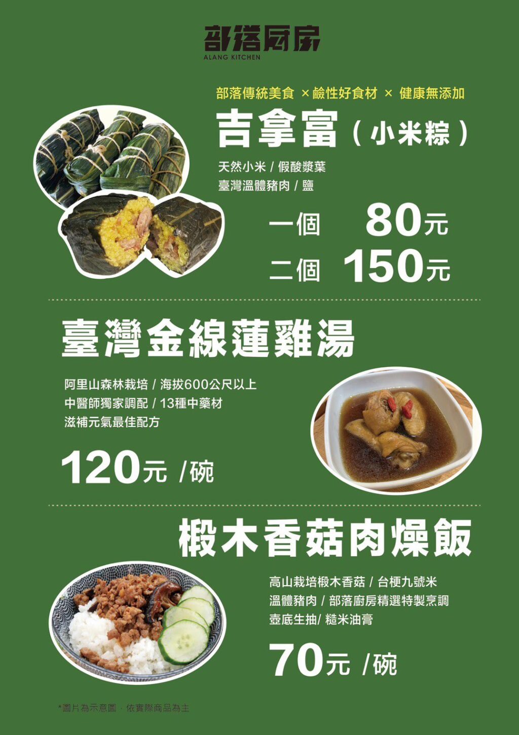 美味的馬告剝皮辣椒香腸、來自臺灣溫體豬肉加甲酸漿葉與天然小米製作的部落吉拿富,來自阿里山海拔600公尺以上高山種植的臺灣金線連,搭配中醫配方做成的金線連雞湯與椴木香菇肉燥飯,和小米甜甜圈及部落佐料做成的披薩,都讓人忍不住是食指大動。